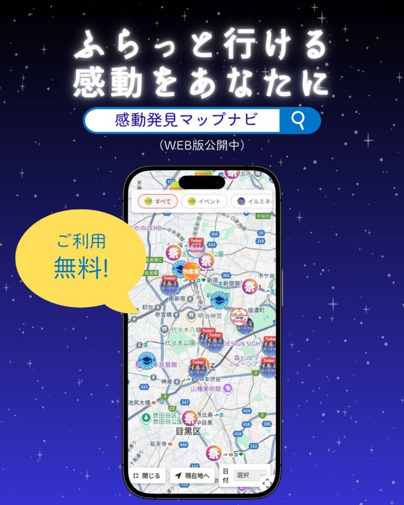 『感動発見マップナビ』を使えば、今いる場所からこれら各会場へのルートを地図上で一目瞭然に確認できます。地図をスワイプするだけで、他にも周辺で開催中の最新イベント情報を逃さずチェックすることも可能です。